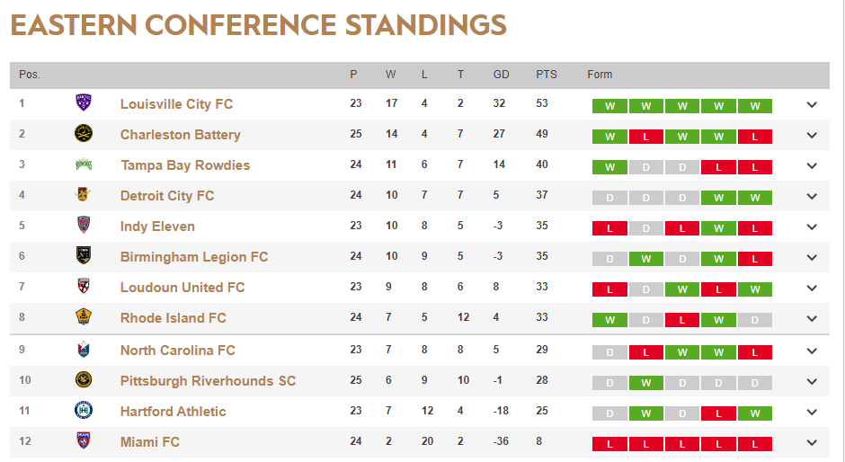 We’re level on points with Loudoun United but they currently have the tiebreaker over us. A win in this game though could push us up to 5th depending on other results. I recently said that Louisville, Charleston and Tampa Bay were locks for the top 3 but I may have spoken too soon in the case of Tampa Bay. They’ve started to fall off a bit in recent games, as you can see that they are winless in their last 4. If Tampa Bay continue to slide, there could be a fight for both 3rd and 4th in the conference as we push towards the end of the season. Coming into the season, I just wanted us to make the playoffs. But seeing how we’ve grown as a team this year, I really do think we have a shot at a home playoff game, albeit an outside chance at this point.