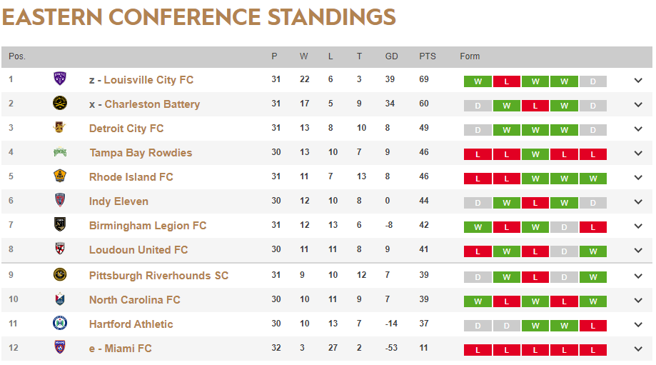 Looking at the standings, we do have a possibility of getting a home playoff match. This win over Tampa Bay puts us in 5th currently, level on points with the Rowdies. Tampa Bay does have the tiebreaker over us due to their 4-1 win earlier in the season giving them a 5-4 aggregate lead over our two matchups. The other team that we’re really competing with for a home playoff game is Indy Eleven. Indy have a game in hand on us but that game comes Tuesday night at Loudoun United. A win for Indy would put them ahead of us and into 5th. But a draw or loss keeps them behind us with the same number of games played. That puts destiny in our own hands as far as keeping ourselves ahead of them in the standings. This is especially important as just like Tampa Bay, Indy Eleven has the tiebreaker over us. For Indy, it’s due to our infamous loss against them earlier in the season in the game before our home derby against Hartford.
