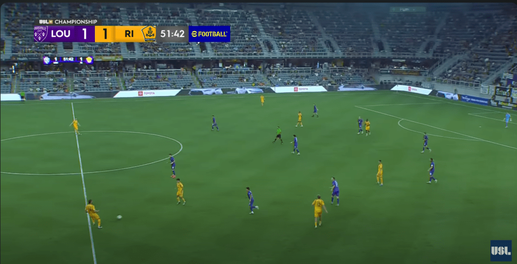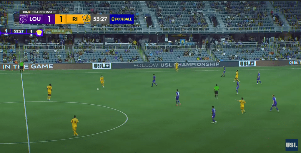 There is not a soul in the middle of the pitch. And when there might be one Rhode Island FC player hanging there, they’re surrounded by 2-3x more opponents as we see here (poor Amos):