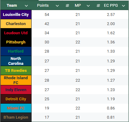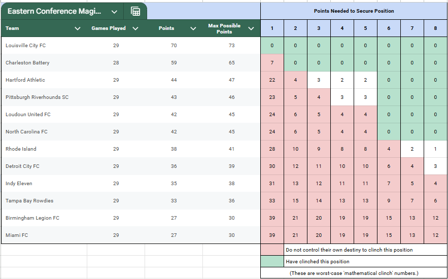 This view should tell you exactly how many more points each team needs in order to definitively secure a specific position in the USL Eastern Conference table, without relying on the teams around them dropping points. Most of us will need no reminder that the top eight in each conference qualify for the playoffs, and the top four will host a home playoff match.