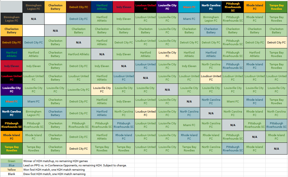 The USL tiebreaker rules use head-to-head record, then goal differential in head-to-head matchups, followed by points per game vs. in-conference opponents.