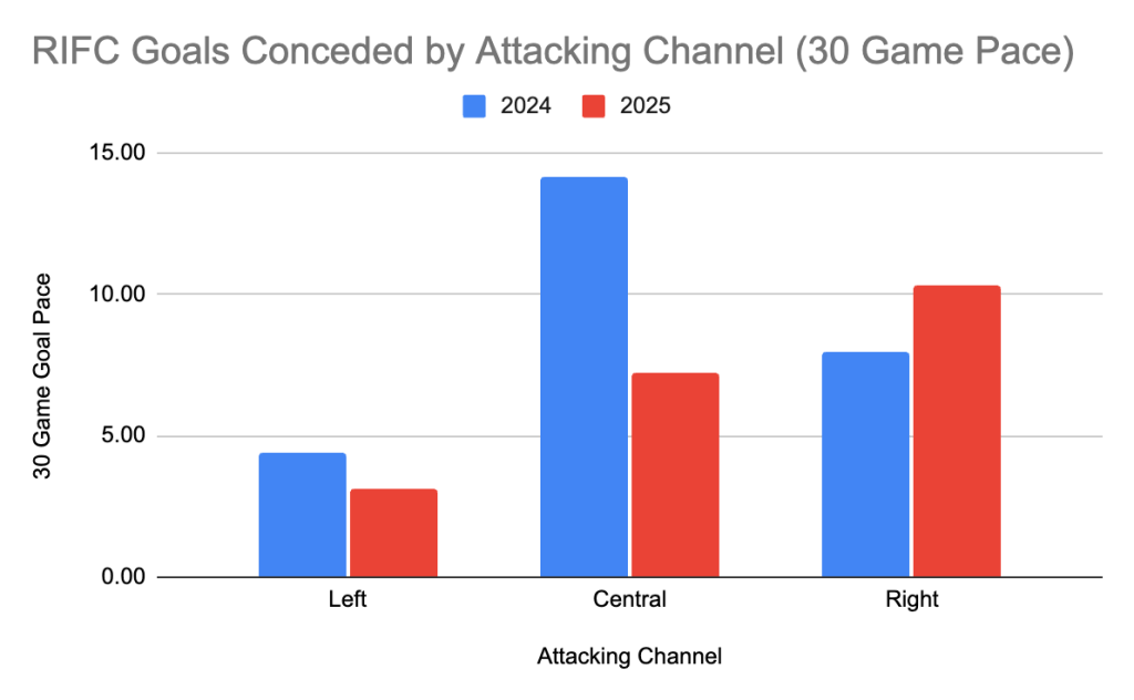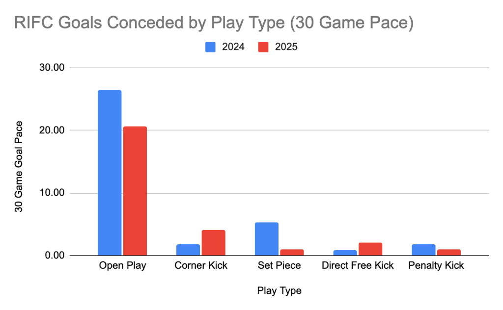 While RIFC wasn’t scoring from corner kicks, they sure as hell were still conceding from them, 134.5% more than 2024, no less. They were less vulnerable from other set pieces, which decreased by 80.5%.