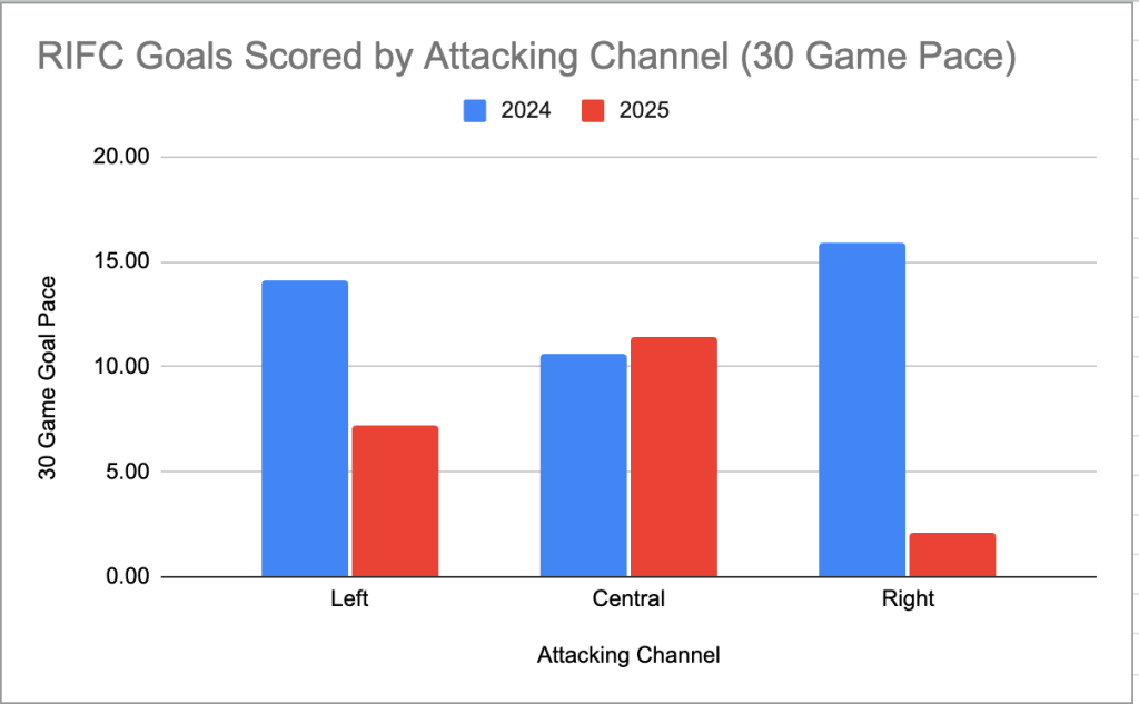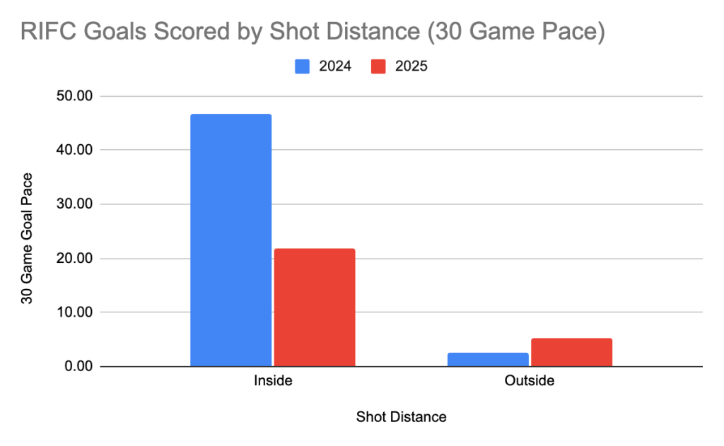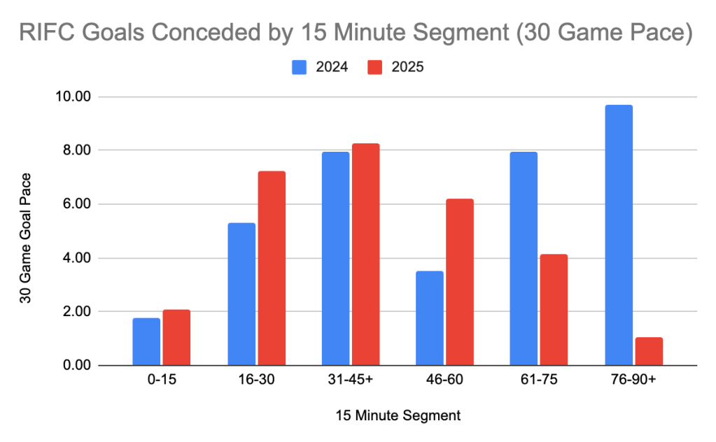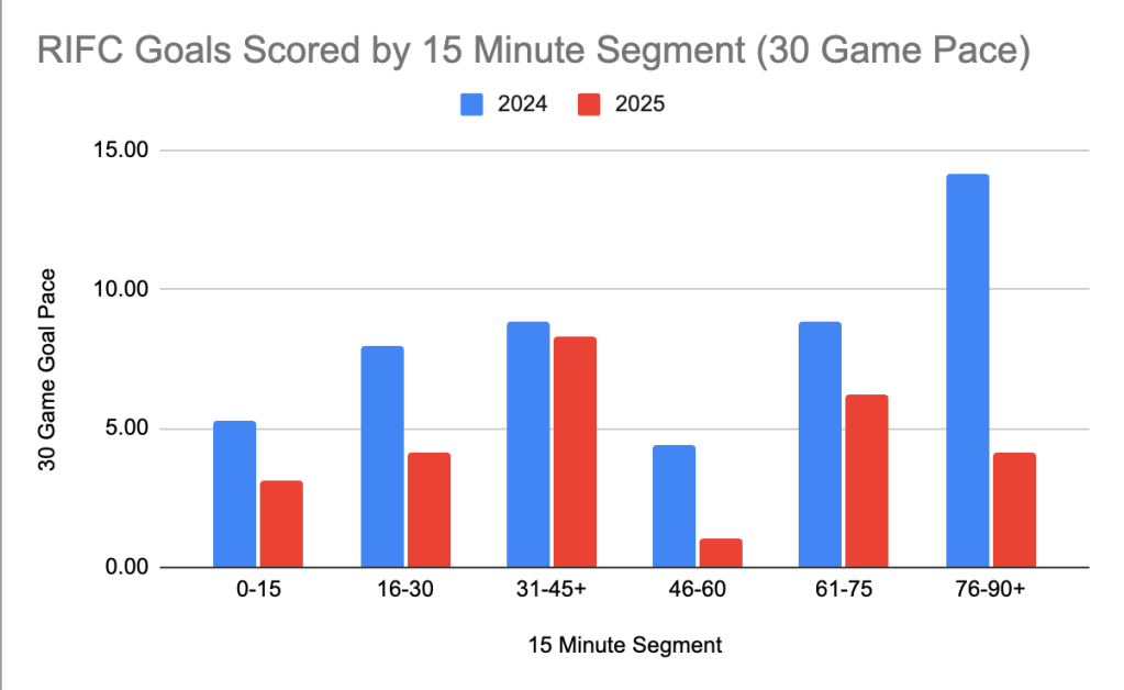 In 2024, RIFC were lethal in the final 15 minutes of matches, a stat that was brought up on nearly every broadcast that season. But those goals dried up in 2025, with a 70.7% decrease. The part I find the most interesting is that RIFC was able to maintain its goal production during the 15 minutes leading into halftime, but saw its biggest decrease (76.6%) during the 15 minutes after the break. I’ve got no clue what Khano has been saying in the dressing room, but he should probably switch it up in 2026, because it clearly wasn’t working.