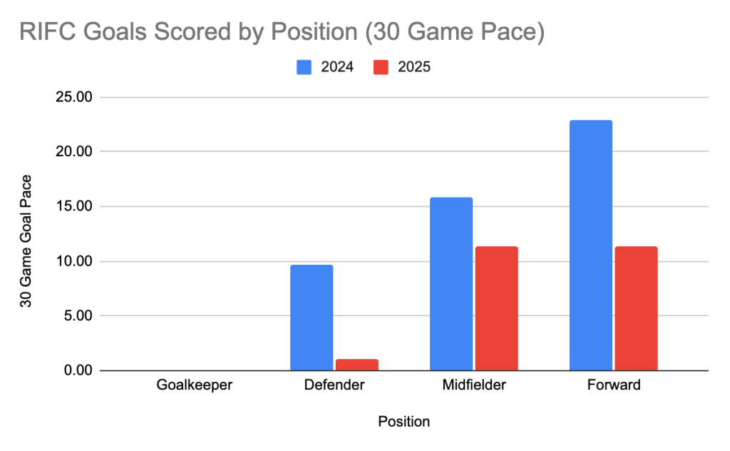 With the previously mentioned set piece issues, it should be no surprise that there was only that single goal scored by an RIFC defender during the regular season. Though in all honesty, that’s a point of contention in and of itself for it was scored by Hugo Bacharach. He’s still listed as a defender on the RIFC roster, and that’s the criteria for this stat. The bigger issue here is the fact that RIFC midfielders scored just as many league goals as the forwards. With the first real shakeup in that room coming in the form of the departure of Chico and the addition of Leo Afonso, let’s hope that Khano has found a way to change the dynamic of that group to hopefully find a way back to its 2024 form.